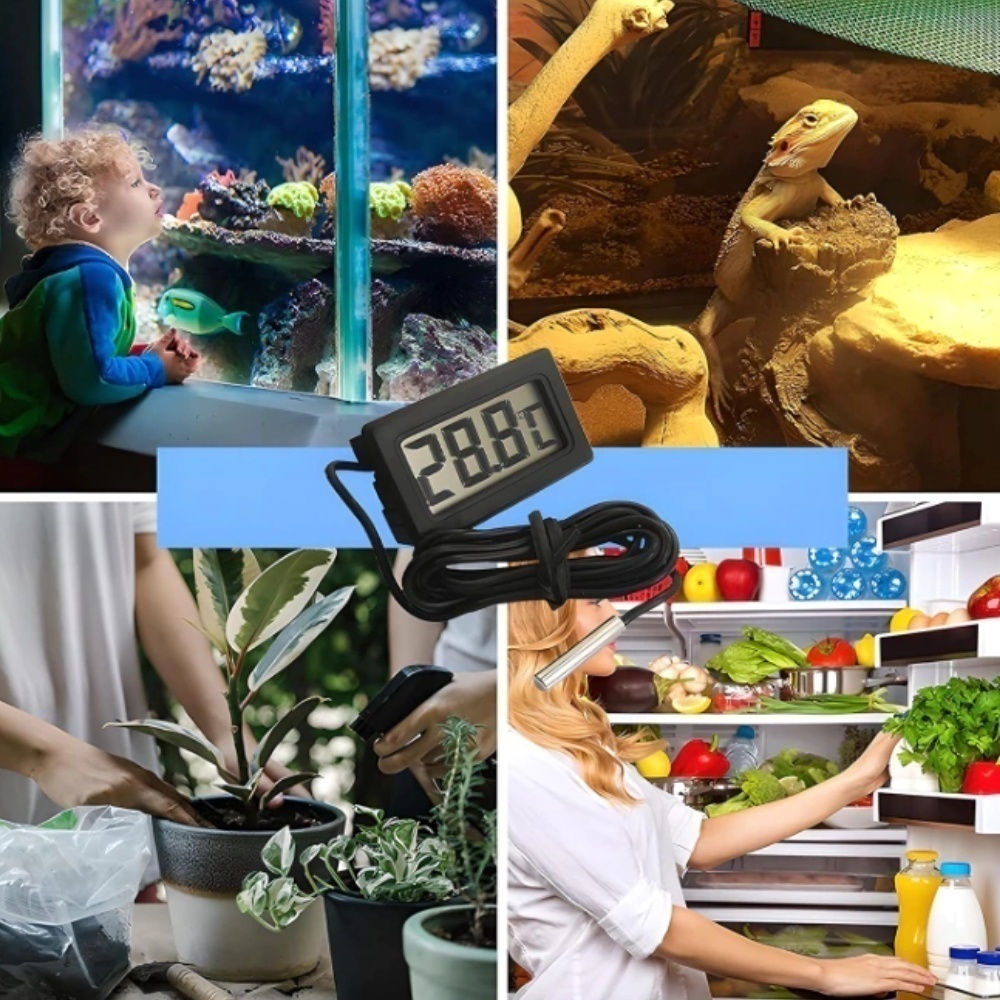 Medidor de temperatura con Sensor impermeable: equipado con una sonda resistente al agua de alta precisión, puede comprobar la temperatura de interiores y exteriores como habitaciones con aire acondicionado, frigoríficos, acuarios o incluso la temperatura del agua y la temperatura corporal.Pantalla grande: paneles LCD en línea, resistente a la humedad.Amplio rango de medición de temperatura de -50 °C hasta 70 °C.Mini tamaño: el termómetro digital de tamaño compacto y elegante con carcasa ultrafina, se puede poner en cualquier lugar. Herramienta de medicion ideal para interior, exterior, casa, laboratorio, biblioteca, etc.DATOS TECNICOS:- Medidas: 48 mm x 28.6 mm x 15.2 mm Aprox.- Longitud del cable: 100 cm.- Rango de medición: -50 °C hasta 70 °C.- Precisión: ± 1 ºc.- Alimentación: 1 LR44 pilas de botón (incluidas).